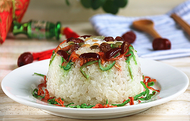 八宝饭的用才讲究,工艺相当繁复,象征团团圆圆。八宝饭中的莲子象征婚姻和谐,桂圆象征团圆,金桔象征吉利,红枣象征早生贵子,蜜冬瓜、蜜樱桃象征生活甜蜜,薏仁象征长寿,瓜子仁则寓意平安无灾。由此看来,八宝饭好像一只聚宝盆,寓意新的一年能够拥有更多福气。